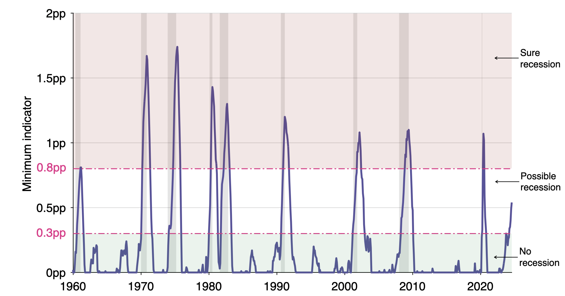 Figure 3: Minimum indicator with two-sided recession rule in the United States, 1960–2024